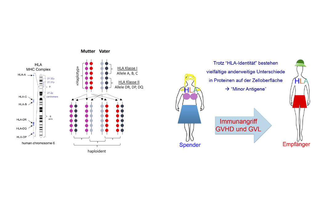 Damit diese Immunattacke des Spender:innen-Immunsystems sich nicht zu heftig gegen Zellen in dem:der Empfänger:in richtet, müssen sich Spender:in und Empfänger:in in bestimmten Merkmalen des Immunsystems (den HLA-Typen; humane Leukozytenantigene) ausreichend gleichen. Diese genetischen Merkmale von Interesse für die Transplantationsimmunologie liegen auf dem 6. Chromosom, und werden gebündelt vererbt. Jeder Mensch erhält einen Satz Merkmale von Vater und Mutter. Jedes Geschwisterpaar hat entsprechend eine 25%ige Chance, zwei idente Stränge von Vater und Mutter geerbt zu haben; eine 50%ige Wahrscheinlichkeit, in einem Strang übereinzustimmen, und eine 25%ige Wahrscheinlichkeit in keinem der Merkmalsstränge übereinzustimmen.