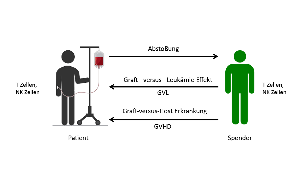 Neben Stammzellen befinden sich im Transplantat auch reife, langlebige Immunzellen, die die Aufgabe haben, fremde Zellen zu erkennen und zu attackieren. Hierdurch trägt das Spender:innen-Immunsystem dazu bei, residuelle Tumorzellen in dem:der Empfänger:in zu attackieren, und auch im weiteren Verlauf unter Kontrolle zu halten (sogenannter „Graft-versus-Leukemia“-Effekt). Bei der allogenen Stammzelltransplantation handelt es sich daher um eine Art „Immunzelltherapie“. Attackieren Spender:innen-Immunzellen hingegen gesunde Zellen und Gewebe des:der Patient:in, so spricht man von einer „Transplantat-gegen-Wirt-Reaktion“ (Graft-versus-Host-Erkrankung).