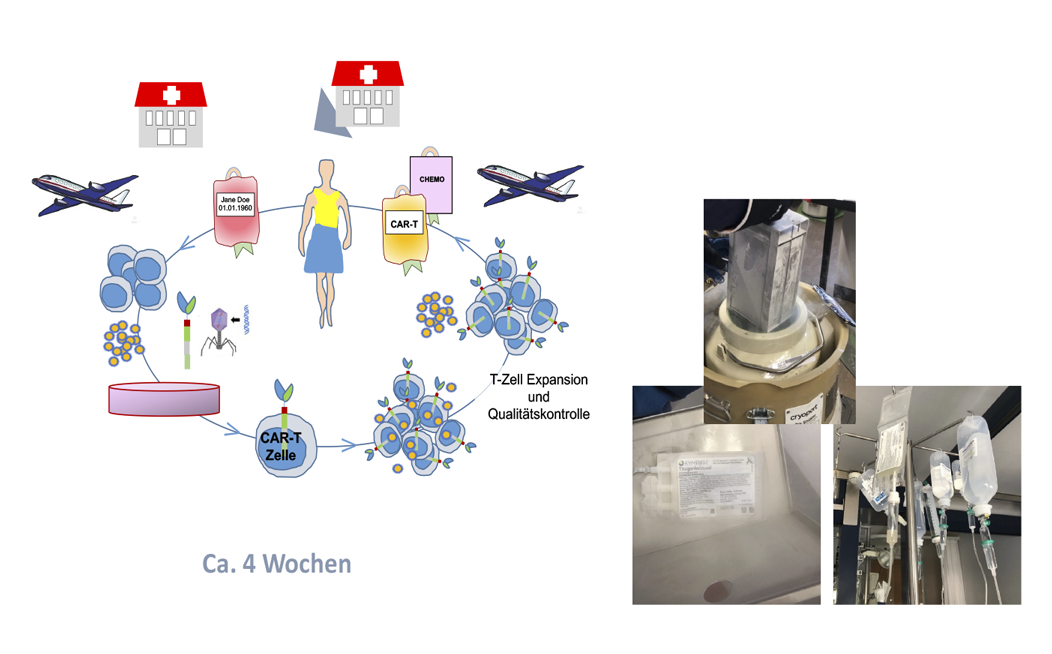 Nach ca. 4 Wochen wird das fertiggestellte CAR-T Produkt tiefgefroren angeliefert und steht dann zur Infusion in den Patient:innen zur Verfügung. Vor Infusion der CAR-T Zellen wird üblicherweise eine 3-tägige Chemotherapie verabreicht.