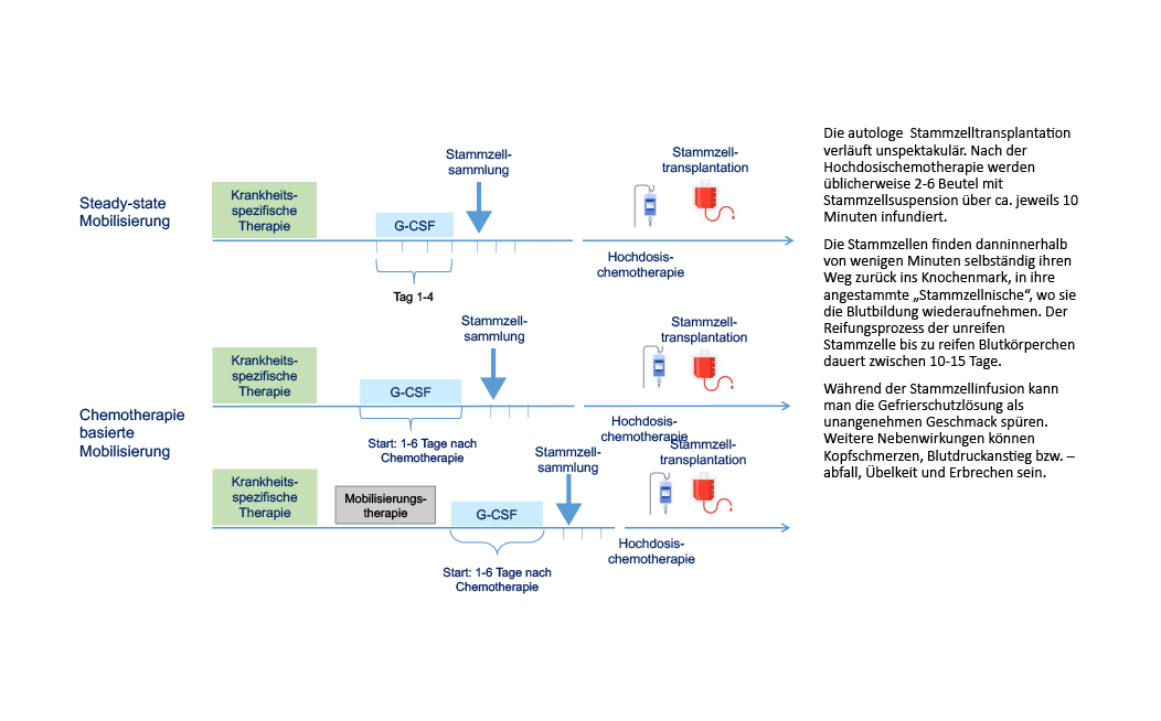 Die Intensität der Hochdosis-Chemotherapie ist so stark, dass neben den bösartigen Zellen (Tumorzellen) auch das Knochenmark und somit die Blutbildung stark geschädigt wird, sodass es Wochen bis Monate bis zur Erholung bedürfte. Um eine rasche Erholung der Blutbildung nach Hochdosis-Chemotherapie zu gewährleisten, werden dem Patient:innen im Vorfeld autologe Blutstammzellen entnommen und eingefroren. Nach der Hochdosis-Chemotherapie werden die Stammzellen am Patient:innenbett aufgetaut und über einen zentralen Venenkatheter rückgegeben, um so die Zeit der sogenannten „Aplasie“ auf wenige Tage (ca. 2 Wochen) zu verkürzen.