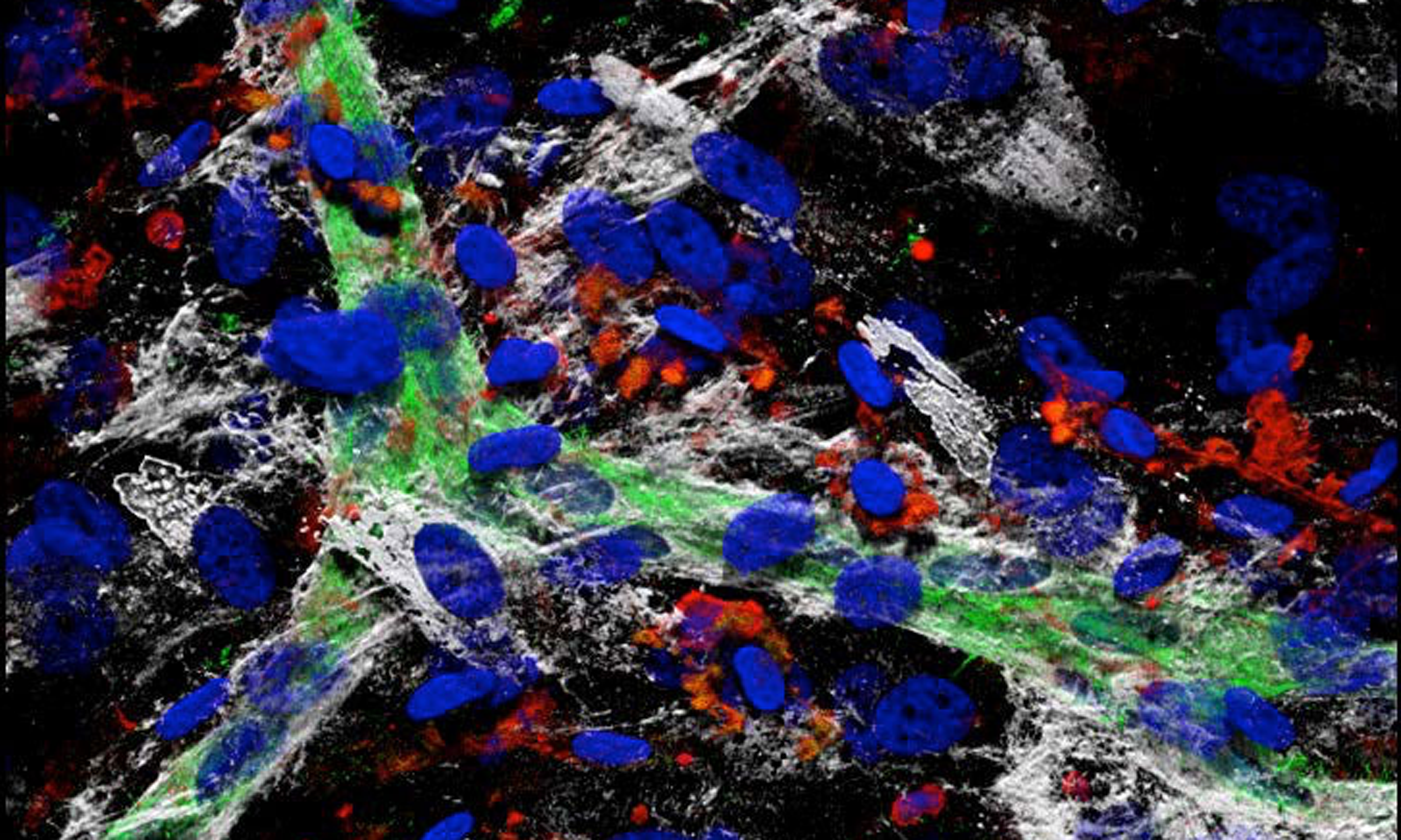 3D-Zellkulturen simulieren im Vergleich zu herkömmlichen 2D-Zellkulturen die in vivo Situation viel genauer, da die drei-dimensionale Anordnung Einfluss hat auf Zellfunktionen, Zell-Zell-Interaktionen und – Kontakte sowie Wechselwirkungen mit der extrazellulären Matrix. Der Fokus in unserem Labor ist die Erforschung zirkulierender Vorläuferzellen, die bei der Blutgefäßneubildung im Rahmen der Regeneration nach Gewebeschädigung maßgeblich beteiligt sind. Mit der Etablierung eines 3D Nischenmodells konnten wir zeigen, dass ein komplexes synergistisches Netzwerk aus zellulären, extrazellulären und parakrinen Interaktionen zwischen mesenchymalen Stromalzellen (MSC), hematopoetischen Vorläuferzellen und Immunzellen aus dem Blut zur de-novo-Bildung von Gefäßstrukturen durch Selbstorganisation führen kann.