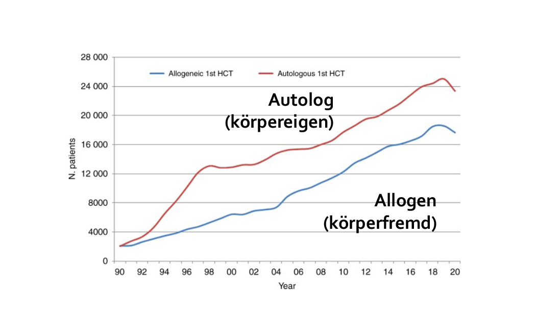 2020 wurden dem Register der European Society of Blood & Marrow Transplantation (EBMT) 45.365 hematopoetische Transplantationen bei 41.016 Patient:innen gemeldet. Davon waren 18.796 (41%) allogene (fremde Stammzellen) und 26.568 (59%) autologe (Patient:innen-eigene) Stammzelltransplantationen.