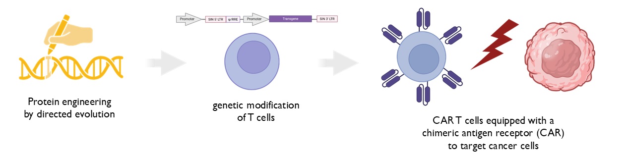Ein zweiter Schwerpunkt ist die Entwicklung von neuen innovativen Zelltherapien. Mithilfe von Methoden aus dem Protein Engineering (directed evolution, Hefedisplay) können wir Proteine so verändern, dass sie von uns erwünschte Charakteristika aufweisen. Das kann zum Beispiel eine höhere Stabilität oder Spezifität sein, oder auch eine stärkere Bindung an ein anderes Protein. Wir setzen High-Throughput Methoden ein um Proteinlibraries zu screenen und auf die gewünschten Eigenschaften zu selektieren.